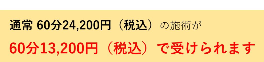 キャンペーン期間中は、メディスンマッサージがはじめての方も2回目以降の方も、通常 60分24,200円(税込)の施術を60分13,200円(税込)で受けられます。(60分の施術のみがキャンペーンの対象です)
