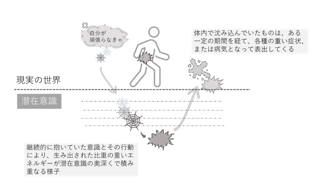 この図では、知らず知らずのうちにため込んだ、比重の重い意識によるエネルギーが、一定の期間を経て、症状や病気となって表出してくる様子を描いています。