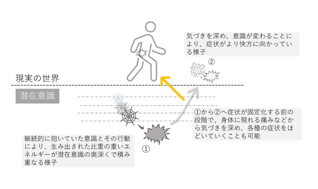 図2のように、潜在意識に埋もれているエネルギーは、各種の症状、または病気を通して、今回の例(椎間板ヘルニアの手術)のように切迫感を表すなど、自分を見つめることの大切さを伝えてくれています。
